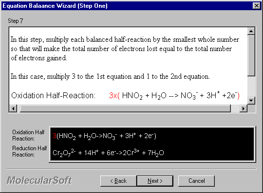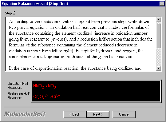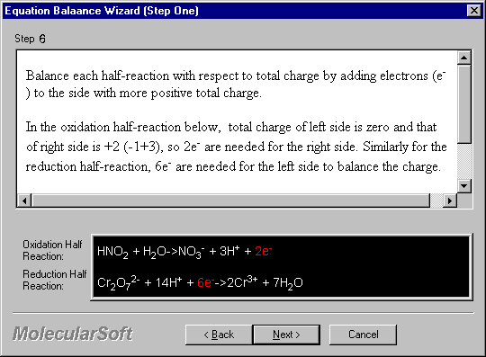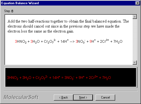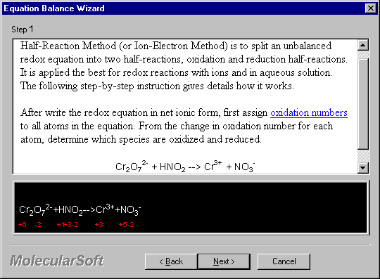 The Wizard for Half-Equation Method walks through step-by-step in balancing an equation with detailed guide side-by-side.