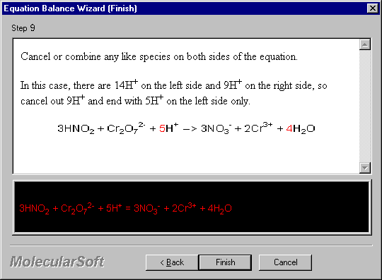 12. Click Finish. The wizard walk-through is complete and it returns to the Equation Balance main screen with the balanced equation displayed in red.