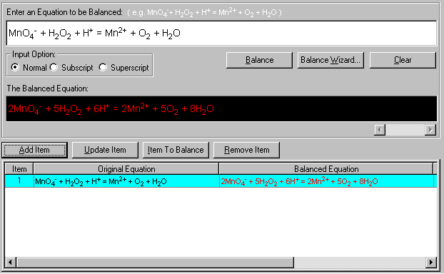 The item is now added into the table. The items in black are the original unbalanced equation and the items in red are the balanced equations.