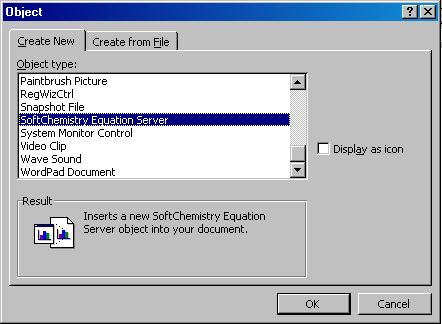 4. Select SoftChemistry Equation Object 1.5 and click OK. The Equation module is displayed over MS Word main window.